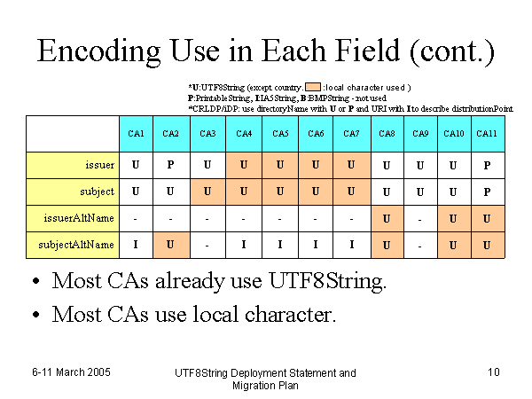 Encoding Use in Each Field (cont.) Most CAs already use UTF8String. Most CAs use local character. *U:UTF8String (except country. P:PrintableString, I:IA5String, B:BMPString -:not used *CRLDP/iDP: use directoryName with U or P and URI with I to describe distributionPoint :local character used ) |
