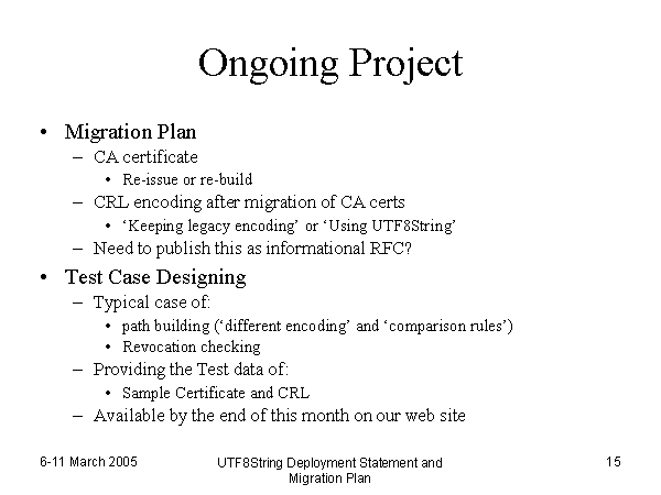 Ongoing Project Migration Plan CA certificate Re-issue or re-build CRL encoding after migration of CA certs ‘Keeping legacy encoding’ or ‘Using UTF8String’ Need to publish this as informational RFC? Test Case Designing Typical case of: path building (‘different encoding’ and ‘comparison rules’) Revocation checking Providing the Test data of: Sample Certificate and CRL Available by the end of this month on our web site |