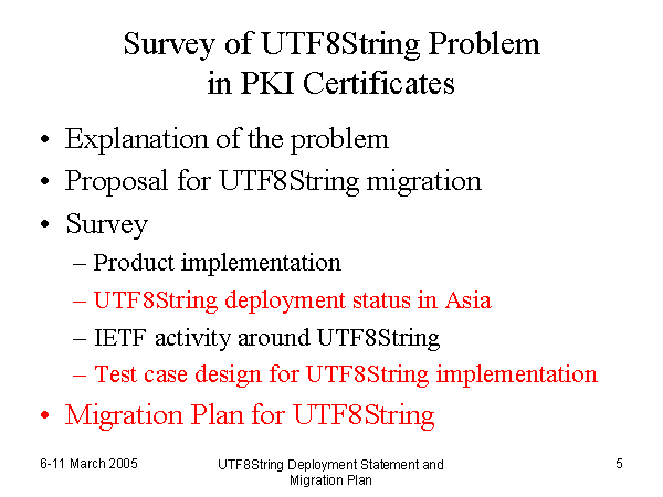 Survey of UTF8String Problem in PKI Certificates Explanation of the problem Proposal for UTF8String migration Survey Product implementation UTF8String deployment status in Asia IETF activity around UTF8String Test case design for UTF8String implementation Migration Plan for UTF8String |