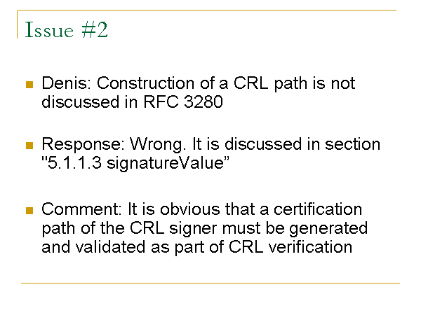 Issue #2 Denis: Construction of a CRL path is not discussed in RFC 3280 Response: Wrong. It is discussed in section "5.1.1.3 signatureValue” Comment: It is obvious that a certification path of the CRL signer must be generated and validated as part of CRL verification |