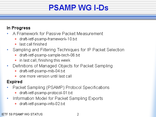 PSAMP WG I-Ds In Progress A Framework for Passive Packet Measurement draft-ietf-psamp-framework-10.txt last call finished Sampling and Filtering Techniques for IP Packet Selection draft-ietf-psamp-sample-tech-06.txt in last call, finishing this week Definitions of Managed Objects for Packet Sampling draft-ietf-psamp-mib-04.txt one more version until last call Expired Packet Sampling (PSAMP) Protocol Specifications draft-ietf-psamp-protocol-01.txt Information Model for Packet Sampling Exports draft-ietf-psamp-info-02.txt |