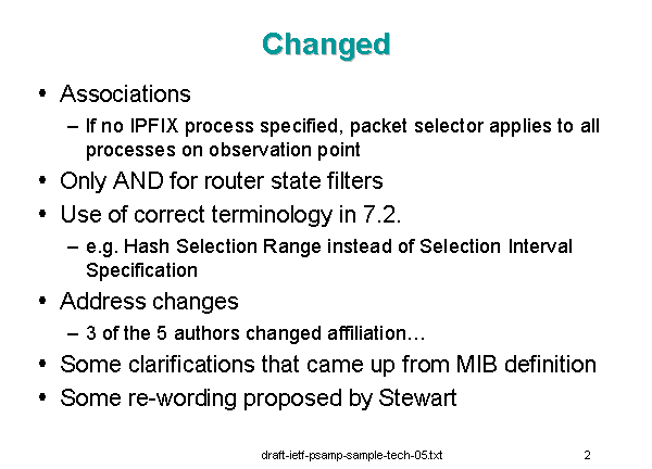 Changed Associations If no IPFIX process specified, packet selector applies to all processes on observation point Only AND for router state filters Use of correct terminology in 7.2. e.g. Hash Selection Range instead of Selection Interval Specification Address changes 3 of the 5 authors changed affiliation… Some clarifications that came up from MIB definition Some re-wording proposed by Stewart |