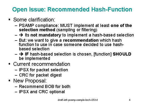 Open Issue: Recommended Hash-Function Some clarification: PSAMP compliance: MUST implement at least one of the selection method (sampling or filtering) ? Its not mandatory to implement a hash-based selection But: we want to give a recommendation which hash function to use in case someone decided to use hash-based selection ? IF hash-based selection is chosen, [function] SHOULD be implemented Current recommendation IPSX for packet selection CRC for packet digest New Proposal: Recommend BOB for both IPSX and CRC optional |