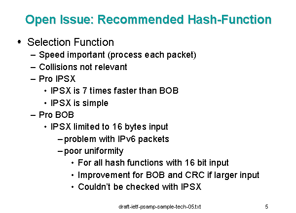 Open Issue: Recommended Hash-Function Selection Function Speed important (process each packet) Collisions not relevant Pro IPSX IPSX is 7 times faster than BOB IPSX is simple Pro BOB IPSX limited to 16 bytes input problem with IPv6 packets poor uniformity For all hash functions with 16 bit input Improvement for BOB and CRC if larger input Couldn’t be checked with IPSX |