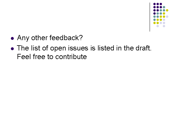 The list of open issues is listed in the draft. Feel free to contribute