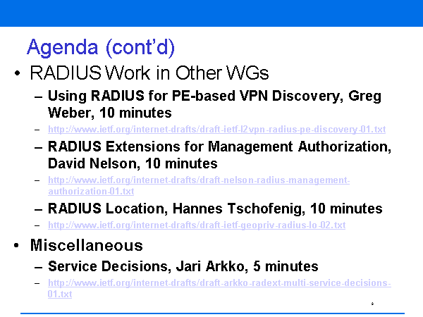 Agenda (cont’d) RADIUS Work in Other WGs Using RADIUS for PE-based VPN Discovery, Greg Weber, 10 minutes http://www.ietf.org/internet-drafts/draft-ietf-l2vpn-radius-pe-discovery-01.txt RADIUS Extensions for Management Authorization, David Nelson, 10 minutes http://www.ietf.org/internet-drafts/draft-nelson-radius-management-authorization-01.txt RADIUS Location, Hannes Tschofenig, 10 minutes http://www.ietf.org/internet-drafts/draft-ietf-geopriv-radius-lo-02.txt Miscellaneous Service Decisions, Jari Arkko, 5 minutes http://www.ietf.org/internet-drafts/draft-arkko-radext-multi-service-decisions-01.txt |