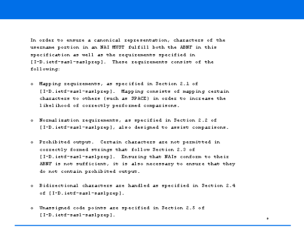 In order to ensure a canonical representation, characters of the username portion in an NAI MUST fulfill both the ABNF in this specification as well as the requirements specified in [I-D.ietf-sasl-saslprep]. These requirements consist of the following: o Mapping requirements, as specified in Section 2.1 of [I-D.ietf-sasl-saslprep]. Mapping consists of mapping certain characters to others (such as SPACE) in order to increase the likelihood of correctly performed comparisons. o Normalization requirements, as specified in Section 2.2 of [I-D.ietf-sasl-saslprep], also designed to assist comparisons. o Prohibited output. Certain characters are not permitted in correctly formed strings that follow Section 2.3 of [I-D.ietf-sasl-saslprep]. Ensuring that NAIs conform to their ABNF is not sufficient, it is also necessary to ensure that they do not contain prohibited output. o Bidirectional characters are handled as specified in Section 2.4 of [I-D.ietf-sasl-saslprep]. o Unassigned code points are specified in Section 2.5 of [I-D.ietf-sasl-saslprep]. |