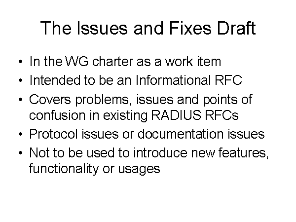 The Issues and Fixes Draft In the WG charter as a work item Intended to be an Informational RFC Covers problems, issues and points of confusion in existing RADIUS RFCs Protocol issues or documentation issues Not to be used to introduce new features, functionality or usages |