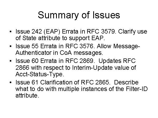 Summary of Issues Issue 242 (EAP) Errata in RFC 3579. Clarify use of State attribute to support EAP. Issue 55 Errata in RFC 3576. Allow Message-Authenticator in CoA messages. Issue 60 Errata in RFC 2869. Updates RFC 2866 with respect to Interim-Update value of Acct-Status-Type. Issue 61 Clarification of RFC 2865. Describe what to do with multiple instances of the Filter-ID attribute. |