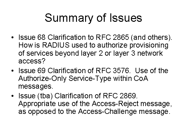 Summary of Issues Issue 68 Clarification to RFC 2865 (and others). How is RADIUS used to authorize provisioning of services beyond layer 2 or layer 3 network access? Issue 69 Clarification of RFC 3576. Use of the Authorize-Only Service-Type within CoA messages. Issue (tba) Clarification of RFC 2869. Appropriate use of the Access-Reject message, as opposed to the Access-Challenge message. |