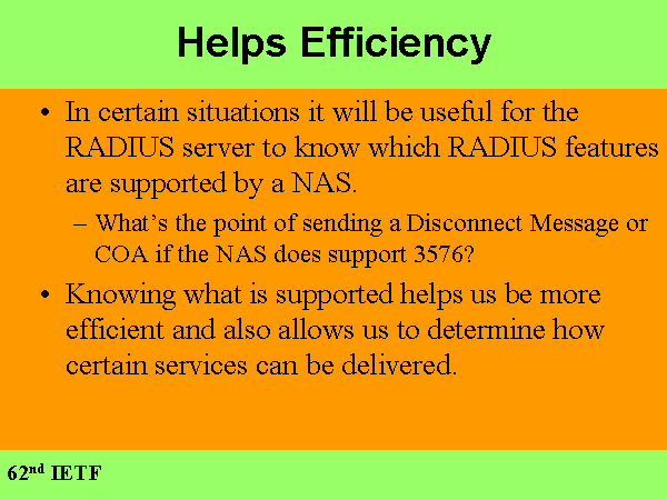 Helps Efficiency In certain situations it will be useful for the RADIUS server to know which RADIUS features are supported by a NAS. What’s the point of sending a Disconnect Message or COA if the NAS does support 3576? Knowing what is supported helps us be more efficient and also allows us to determine how certain services can be delivered. |