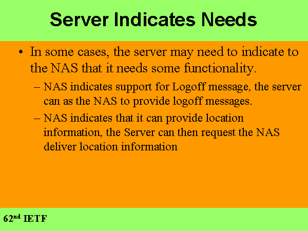 Server Indicates Needs In some cases, the server may need to indicate to the NAS that it needs some functionality. NAS indicates support for Logoff message, the server can as the NAS to provide logoff messages. NAS indicates that it can provide location information, the Server can then request the NAS deliver location information |