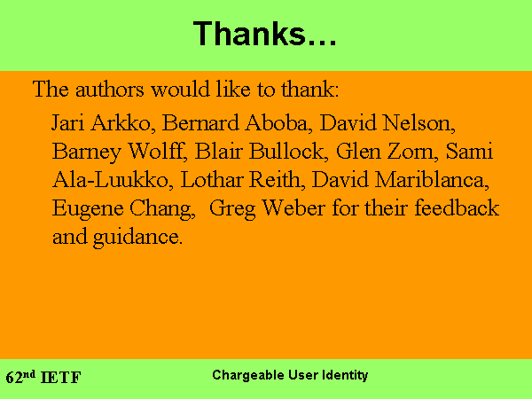 Jari Arkko, Bernard Aboba, David Nelson, Barney Wolff, Blair Bullock, Glen Zorn, Sami Ala-Luukko, Lothar Reith, David Mariblanca, Eugene Chang, Greg Weber for their feedback and guidance.