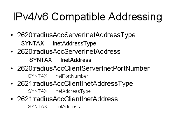 IPv4/v6 Compatible Addressing 2620:radiusAccServerInetAddressType SYNTAX InetAddressType 2620:radiusAccServerInetAddress SYNTAX InetAddress 2620:radiusAccClientServerInetPortNumber SYNTAX InetPortNumber 2621:radiusAccClientInetAddressType SYNTAX InetAddressType 2621:radiusAccClientInetAddress SYNTAX InetAddress |