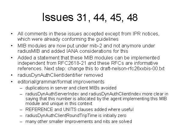 Issues 31, 44, 45, 48 All comments in these issues accepted except from IPR notices, which were already conforming the guidelines MIB modules are now put under mib-2 and not anymore under radiusMIB and added IANA considerations for this Added a statement that these MIB modules can be implemented independent from RFC2618-21 and these RFCs are informative references. Next step: change this to draft-nelson-rfc26xxbis-00.txt radiusDynAuthClientIdentifier removed editorial/grammar/format improvements duplications in server and client MIBs avoided radiusDynAuthServerIndex and radiusDynAuthClientIndex more clear in saying that this number is allocated by the agent implementing this MIB module and unique in this context REFERENCE and UNITS clauses added where useful radiusDynAuthClientRoundTripTime is initially zero many other smaller improvements and nits are solved |