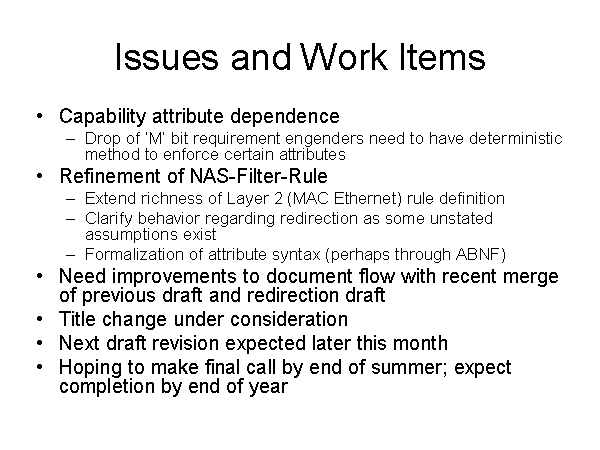 Issues and Work Items Capability attribute dependence Drop of ‘M’ bit requirement engenders need to have deterministic method to enforce certain attributes Refinement of NAS-Filter-Rule Extend richness of Layer 2 (MAC Ethernet) rule definition Clarify behavior regarding redirection as some unstated assumptions exist Formalization of attribute syntax (perhaps through ABNF) Need improvements to document flow with recent merge of previous draft and redirection draft Title change under consideration Next draft revision expected later this month Hoping to make final call by end of summer; expect completion by end of year |