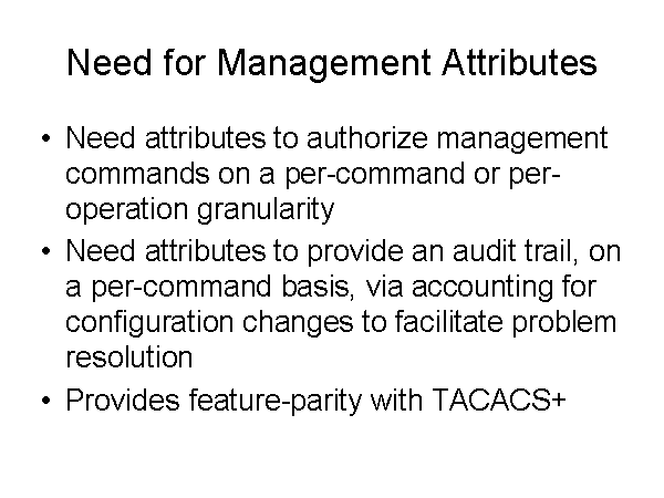 Need for Management Attributes Need attributes to authorize management commands on a per-command or per-operation granularity Need attributes to provide an audit trail, on a per-command basis, via accounting for configuration changes to facilitate problem resolution Provides feature-parity with TACACS+ |