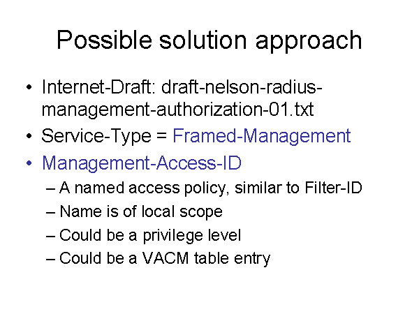 Possible solution approach Internet-Draft: draft-nelson-radius-management-authorization-01.txt Service-Type = Framed-Management Management-Access-ID A named access policy, similar to Filter-ID Name is of local scope Could be a privilege level Could be a VACM table entry |