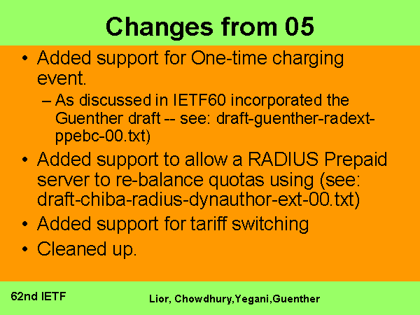 Changes from 05 Added support for One-time charging event. As discussed in IETF60 incorporated the Guenther draft -- see: draft-guenther-radext-ppebc-00.txt) Added support to allow a RADIUS Prepaid server to re-balance quotas using (see: draft-chiba-radius-dynauthor-ext-00.txt) Added support for tariff switching Cleaned up. |