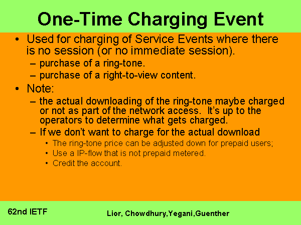 One-Time Charging Event Used for charging of Service Events where there is no session (or no immediate session). purchase of a ring-tone. purchase of a right-to-view content. Note: the actual downloading of the ring-tone maybe charged or not as part of the network access. It’s up to the operators to determine what gets charged. If we don’t want to charge for the actual download The ring-tone price can be adjusted down for prepaid users; Use a IP-flow that is not prepaid metered. Credit the account. |