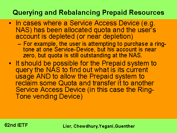 Querying and Rebalancing Prepaid Resources In cases where a Service Access Device (e.g. NAS) has been allocated quota and the user’s account is depleted (or near depletion) For example, the user is attempting to purchase a ring-tone at one Service-Device, but his account is near zero, but quota is still outstanding at the NAS. It should be possible for the Prepaid system to query the NAS to find out what is its current usage AND to allow the Prepaid system to reclaim some Quota and transfer it to another Service Access Device (in this case the Ring-Tone vending Device) |