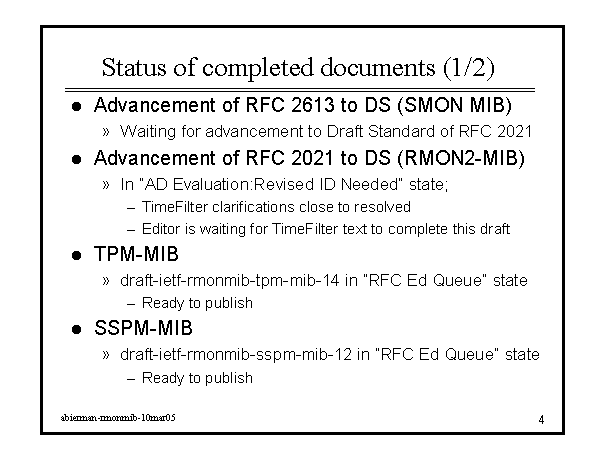 Status of completed documents (1/2) Advancement of RFC 2613 to DS (SMON MIB) Waiting for advancement to Draft Standard of RFC 2021 Advancement of RFC 2021 to DS (RMON2-MIB) In “AD Evaluation:Revised ID Needed” state; TimeFilter clarifications close to resolved Editor is waiting for TimeFilter text to complete this draft TPM-MIB draft-ietf-rmonmib-tpm-mib-14 in “RFC Ed Queue” state Ready to publish SSPM-MIB draft-ietf-rmonmib-sspm-mib-12 in “RFC Ed Queue” state Ready to publish |