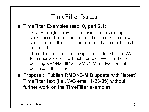 TimeFilter Issues TimeFilter Examples (sec. 8, part 2.1) Dave Harrington provided extensions to this example to show how a deleted and recreated column within a row should be handled. This example needs more columns to be correct. There does not seem to be significant interest in the WG for further work on the TimeFilter text. We can’t keep delaying RMON2-MIB and SMON-MIB advancement because of this issue. Proposal: Publish RMON2-MIB update with “latest” TimeFilter text (i.e., WG email 1/23/05) without further work on the TimeFilter examples |