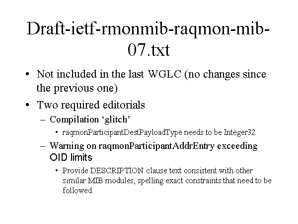 Draft-ietf-rmonmib-raqmon-mib-07.txt Not included in the last WGLC (no changes since the previous one) Two required editorials Compilation ‘glitch’ raqmonParticipantDestPayloadType needs to be Integer32 Warning on raqmonParticipantAddrEntry exceeding OID limits Provide DESCRIPTION clause text consistent with other similar MIB modules, spelling exact constraints that need to be followed |