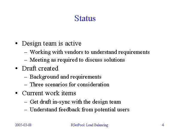 Status Design team is active Working with vendors to understand requirements Meeting as required to discuss solutions Draft created Background and requirements Three scenarios for consideration Current work items Get draft in-sync with the design team Understand feedback from potential users |