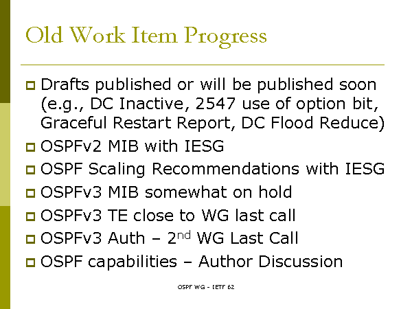 Old Work Item Progress Drafts published or will be published soon (e.g., DC Inactive, 2547 use of option bit, Graceful Restart Report, DC Flood Reduce) OSPFv2 MIB with IESG OSPF Scaling Recommendations with IESG OSPFv3 MIB somewhat on hold OSPFv3 TE close to WG last call OSPFv3 Auth – 2nd WG Last Call OSPF capabilities – Author Discussion |