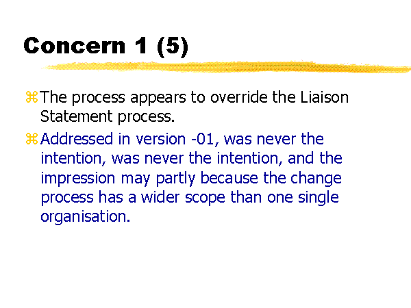 Concern 1 (5) The process appears to override the Liaison Statement process. Addressed in version -01, was never the intention, was never the intention, and the impression may partly because the change process has a wider scope than one single organisation. |