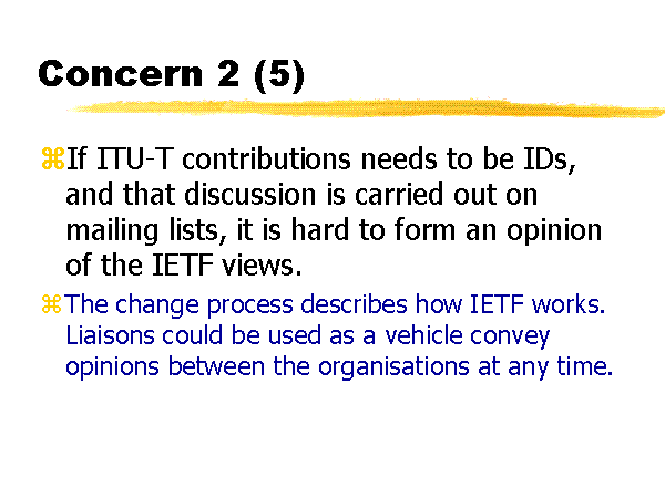 Concern 2 (5) If ITU-T contributions needs to be IDs, and that discussion is carried out on mailing lists, it is hard to form an opinion of the IETF views. The change process describes how IETF works. Liaisons could be used as a vehicle convey opinions between the organisations at any time. |