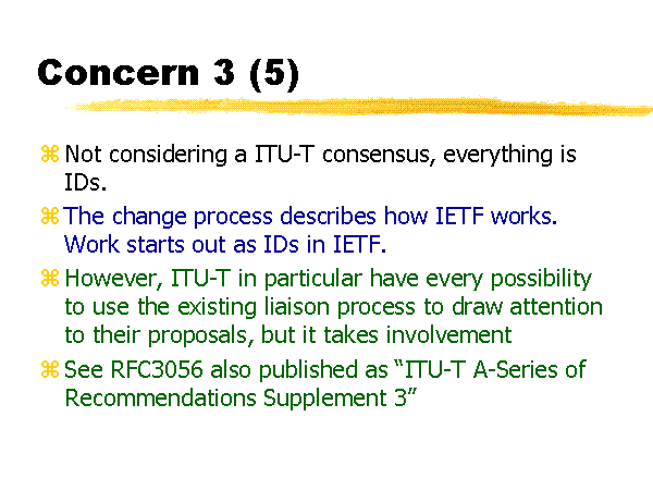 Concern 3 (5) Not considering a ITU-T consensus, everything is IDs. The change process describes how IETF works. Work starts out as IDs in IETF. However, ITU-T in particular have every possibility to use the existing liaison process to draw attention to their proposals, but it takes involvement See RFC3056 also published as “ITU-T A-Series of Recommendations Supplement 3” |