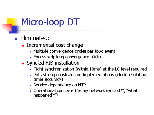 Micro-loop DT Eliminated: Incremental cost change Multiple convergence cycles per topo event Excessively long convergence: O(h) Sync’ed FIB installation Tight synchronization (within 10ms) at the LC level required Puts strong constrains on implementations (clock resolution, timer accuracy) Service dependency on NTP Operational concerns (“is my network sync’ed?”, “what happened?”) |