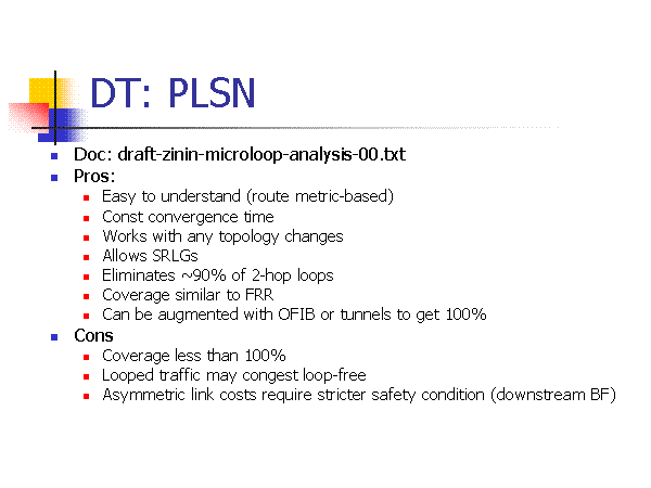 DT: PLSN Doc: draft-zinin-microloop-analysis-00.txt Pros: Easy to understand (route metric-based) Const convergence time Works with any topology changes Allows SRLGs Eliminates ~90% of 2-hop loops Coverage similar to FRR Can be augmented with OFIB or tunnels to get 100% Cons Coverage less than 100% Looped traffic may congest loop-free Asymmetric link costs require stricter safety condition (downstream BF) |