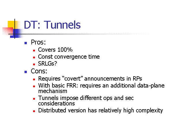 DT: Tunnels Pros: Covers 100% Const convergence time SRLGs? Cons: Requires “covert” announcements in RPs With basic FRR: requires an additional data-plane mechanism Tunnels impose different ops and sec considerations Distributed version has relatively high complexity |