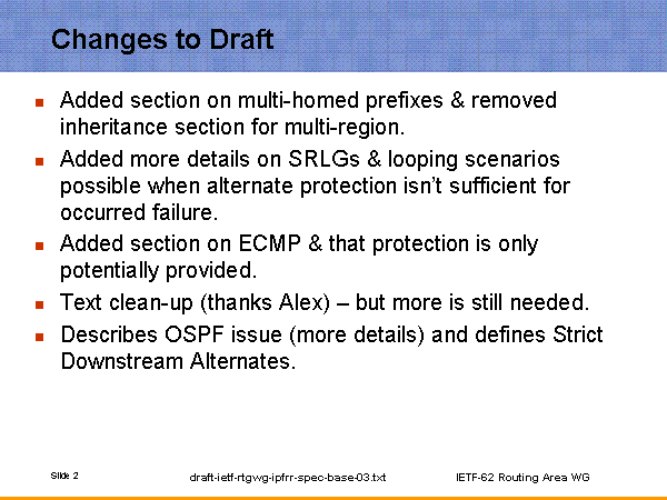 Changes to Draft Added section on multi-homed prefixes & removed inheritance section for multi-region. Added more details on SRLGs & looping scenarios possible when alternate protection isn’t sufficient for occurred failure. Added section on ECMP & that protection is only potentially provided. Text clean-up (thanks Alex) – but more is still needed. Describes OSPF issue (more details) and defines Strict Downstream Alternates. |