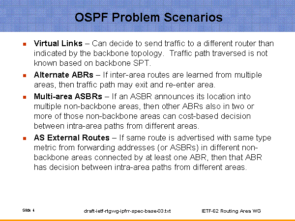 OSPF Problem Scenarios Virtual Links – Can decide to send traffic to a different router than indicated by the backbone topology. Traffic path traversed is not known based on backbone SPT. Alternate ABRs – If inter-area routes are learned from multiple areas, then traffic path may exit and re-enter area. Multi-area ASBRs – If an ASBR announces its location into multiple non-backbone areas, then other ABRs also in two or more of those non-backbone areas can cost-based decision between intra-area paths from different areas. AS External Routes – If same route is advertised with same type metric from forwarding addresses (or ASBRs) in different non-backbone areas connected by at least one ABR, then that ABR has decision between intra-area paths from different areas. |