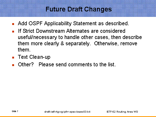 Future Draft Changes Add OSPF Applicability Statement as described. If Strict Downstream Alternates are considered useful/necessary to handle other cases, then describe them more clearly & separately. Otherwise, remove them. Text Clean-up Other? Please send comments to the list. |