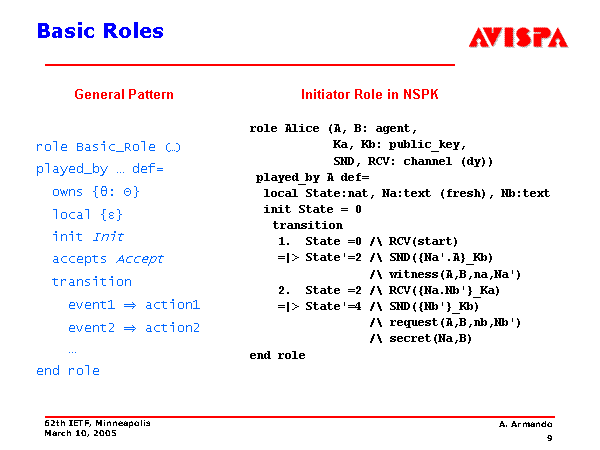 Basic Roles role Basic_Role (…) played_by … def= owns {?: T} local {e} init Init accepts Accept transition event1 ? action1 event2 ? action2 … end role role Alice (A, B: agent, Ka, Kb: public_key, SND, RCV: channel (dy)) played_by A def= local State:nat, Na:text (fresh), Nb:text init State = 0 transition 1. State =0 /\ RCV(start) =|> State'=2 /\ SND({Na'.A}_Kb) /\ witness(A,B,na,Na') 2. State =2 /\ RCV({Na.Nb'}_Ka) =|> State'=4 /\ SND({Nb'}_Kb) /\ request(A,B,nb,Nb') /\ secret(Na,B) end role General Pattern Initiator Role in NSPK |