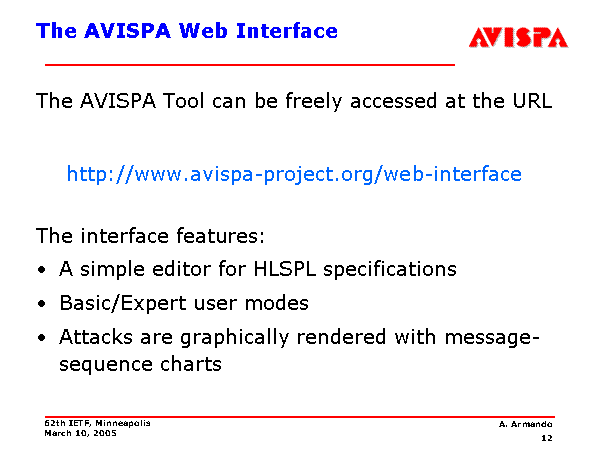 The AVISPA Web Interface The AVISPA Tool can be freely accessed at the URL http://www.avispa-project.org/web-interface The interface features: A simple editor for HLSPL specifications Basic/Expert user modes Attacks are graphically rendered with message-sequence charts |