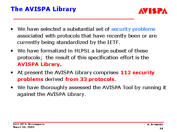 The AVISPA Library We have selected a substantial set of security problems associated with protocols that have recently been or are currently being standardized by the IETF. We have formalized in HLPSL a large subset of these protocols; the result of this specification effort is the AVISPA Library. At present the AVISPA Library comprises 112 security problems derived from 33 protocols. We have thoroughly assessed the AVISPA Tool by running it against the AVISPA Library. |