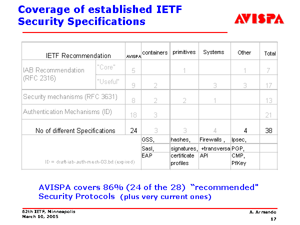 Coverage of established IETF Security Specifications AVISPA covers 86% (24 of the 28) “recommended" Security Protocols (plus very current ones) AVISPA containers primitives Systems Other Total "Core" 5 1 1 7 "Useful" 9 2 3 3 17 8 2 2 1 13 18 3 21 24 3 3 4 4 38 GSS, hashes, Firewalls , Ipsec, Sasl, signatures, +transversal PGP, EAP certificate profiles API CMP, PfKey IETF Recommendation IAB Recommendation (RFC 2316) Security mechanisms (RFC 3631) Authentication Mechanisms (ID) No of different Specifications ID = draft-iab-auth-mech-03.txt (expired) |