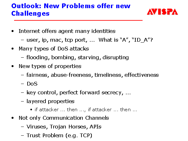 Outlook: New Problems offer new Challenges Internet offers agent many identities user, ip, mac, tcp port, ... What is “A”, “ID_A”? Many types of DoS attacks flooding, bombing, starving, disrupting New types of properties fairness, abuse-freeness, timeliness, effectiveness DoS key control, perfect forward secrecy, ... layered properties if attacker ... then ..., if attacker ... then ... Not only Communication Channels Viruses, Trojan Horses, APIs Trust Problem (e.g. TCP) |