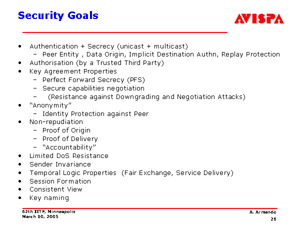 Security Goals Authentication + Secrecy (unicast + multicast) Peer Entity , Data Origin, Implicit Destination Authn, Replay Protection Authorisation (by a Trusted Third Party) Key Agreement Properties Perfect Forward Secrecy (PFS) Secure capabilities negotiation (Resistance against Downgrading and Negotiation Attacks) “Anonymity” Identity Protection against Peer Non-repudiation Proof of Origin Proof of Delivery “Accountability” Limited DoS Resistance Sender Invariance Temporal Logic Properties (Fair Exchange, Service Delivery) Session Formation Consistent View Key naming |