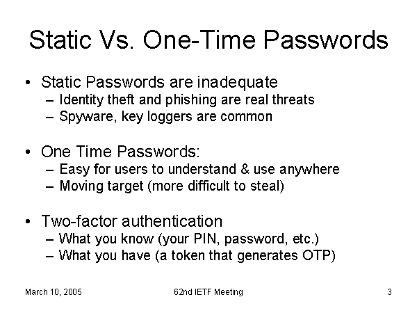 Static Vs. One-Time Passwords Static Passwords are inadequate Identity theft and phishing are real threats Spyware, key loggers are common One Time Passwords: Easy for users to understand & use anywhere Moving target (more difficult to steal) Two-factor authentication What you know (your PIN, password, etc.) What you have (a token that generates OTP) |
