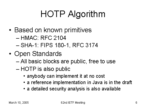 HOTP Algorithm Based on known primitives HMAC: RFC 2104 SHA-1: FIPS 180-1, RFC 3174 Open Standards All basic blocks are public, free to use HOTP is also public anybody can implement it at no cost a reference implementation in Java is in the draft a detailed security analysis is also available |