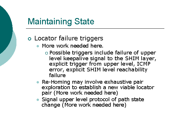 Maintaining State Locator failure triggers More work needed here. Possible triggers include failure of upper level keepalive signal to the SHIM layer, explicit trigger from upper level, ICMP error, explicit SHIM level reachability failure Re-Homing may involve exhaustive pair exploration to establish a new viable locator pair (More work needed here) Signal upper level protocol of path state change (More work needed here) |