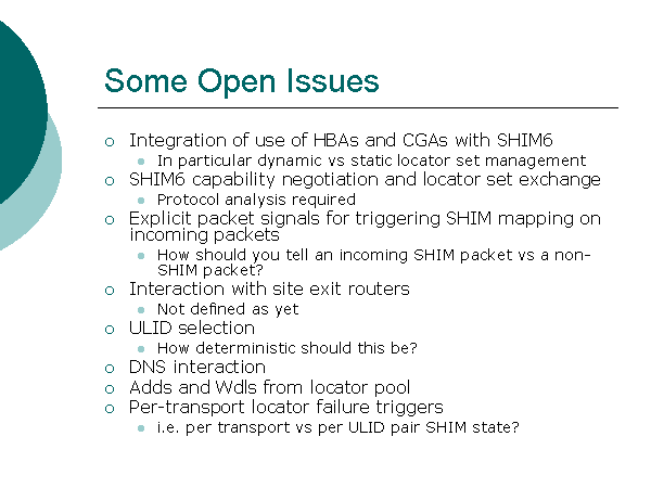 Some Open Issues Integration of use of HBAs and CGAs with SHIM6 In particular dynamic vs static locator set management SHIM6 capability negotiation and locator set exchange Protocol analysis required Explicit packet signals for triggering SHIM mapping on incoming packets How should you tell an incoming SHIM packet vs a non-SHIM packet? Interaction with site exit routers Not defined as yet ULID selection How deterministic should this be? DNS interaction Adds and Wdls from locator pool Per-transport locator failure triggers i.e. per transport vs per ULID pair SHIM state? |