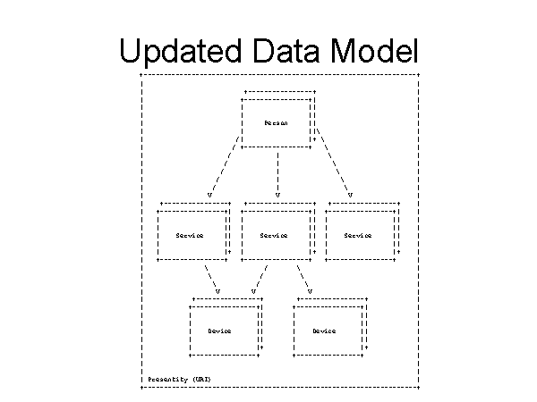 Updated Data Model +--------------------------------------------------------------------+ | | | +----------------+ | | +----------------+| | | | || | | | || | | | Person || | | | ||\ | | /| |+ \ | | / +----------------+ \ | | / | \ | | / | \ | | / | \ | | / | \ | | / | \ | | V V V | | +----------------+ +----------------+ +----------------+ | | +----------------+| +----------------+| +----------------+| | | | || | || | || | | | || | || | || | | | Service || | Service || | Service || | | | || | || | || | | | |+ | |+ | |+ | | +----------------+ +----------------+ +----------------+ | | \ / \ | | \ / \ | | \ / \ | | V V V | | +----------------+ +----------------+ | | +----------------+| +----------------+| | | | || | || | | | || | || | | | Device || | Device || | | | || | || | | | |+ | |+ | | +----------------+ +----------------+ | | | | | | Presentity (URI) | +--------------------------------------------------------------------+ |